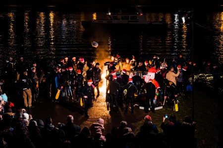 On the way back into town we were stopped in our tracks by a big crowd on the Bernkastel Bridge. During the Christmas season, Fackel Swimmers swim down the river around Bernkastel-Kues, and it’s a big thing in the village. By big, we mean the whole town goes berserk. The local diving community jumps into the freezing water with torches trying to keep them alight, while the crowds go wild at shore. Imagine the sight, the river alight with torch-laden swimmers, a festively-clad brass band banging out tunes on a boat, and a thronging crowd of screaming supporters. It’s a tradition the local community are very proud of and who can blame them, it’s pretty brave to throw yourself in the freezing water at Christmas time. While it may all seem a little insane, you can’t help but get into the spirit of it; they sure know how to have fun.